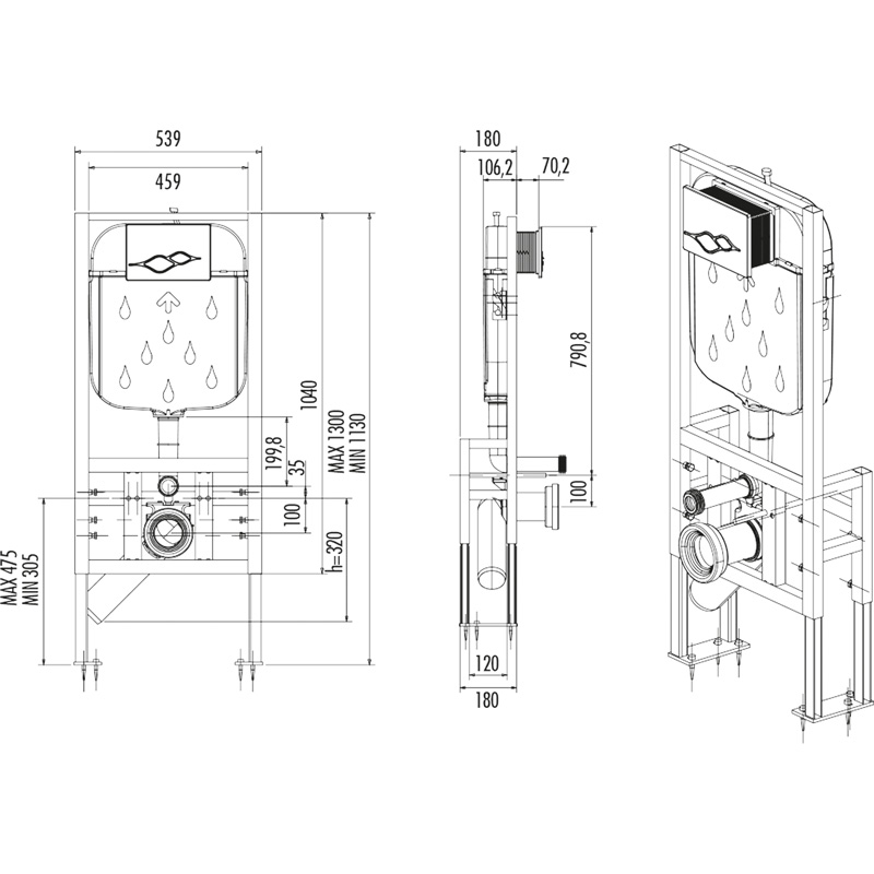 Εντοιχιζόμενο καζανάκι 2 επιλογών 3/6 lit, με αυτοφερόμενο πλαίσιο εγκατάστασης, για επένδυση με γυψοσανίδα. Ρυθμιζόμενο ύψος 113-130cm, κατάλληλο για όλους τους τύπους κρεμαστής λεκάνη.